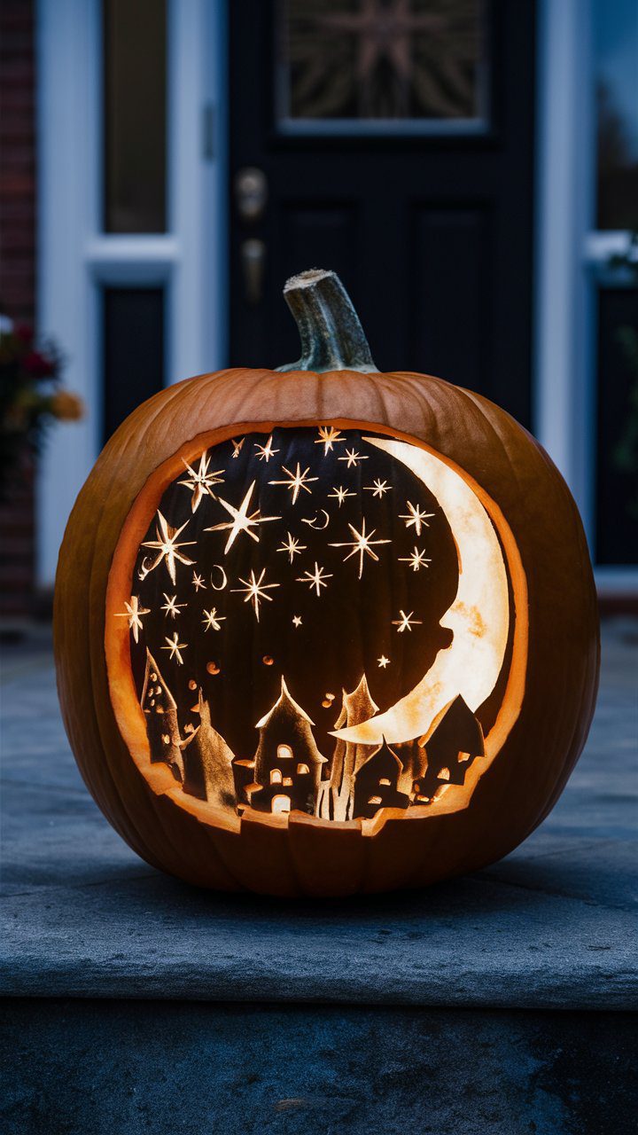 This pumpkin carving idea will not only capture the essence of a serene night sky but also serve as a standout piece in your Halloween decor, blending artistry with the mystique of the night.
