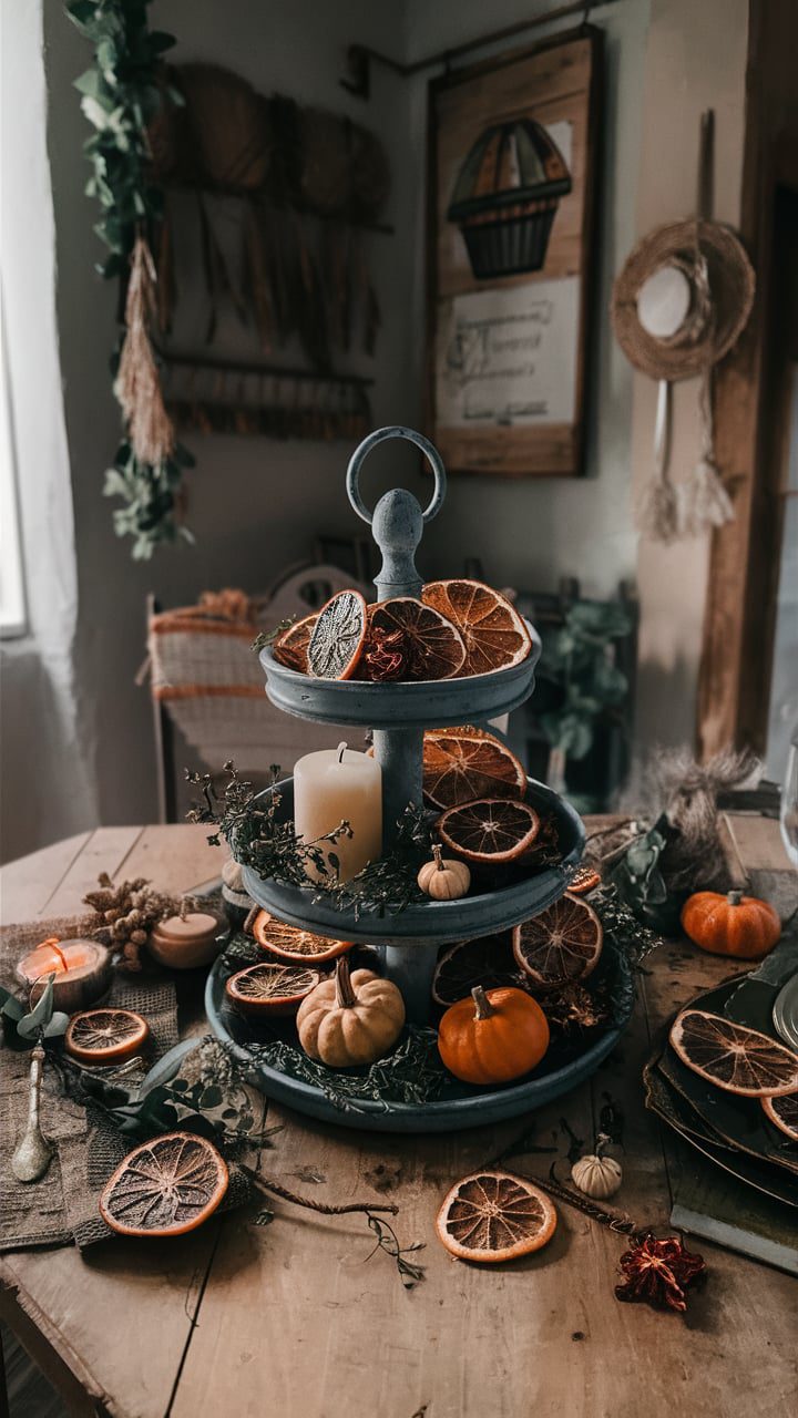 Use dried orange slices to add texture and contrast to a tiered tray. Mix them with candles, greenery, or small pumpkins. This creates a rustic and organic look, perfect for any season.